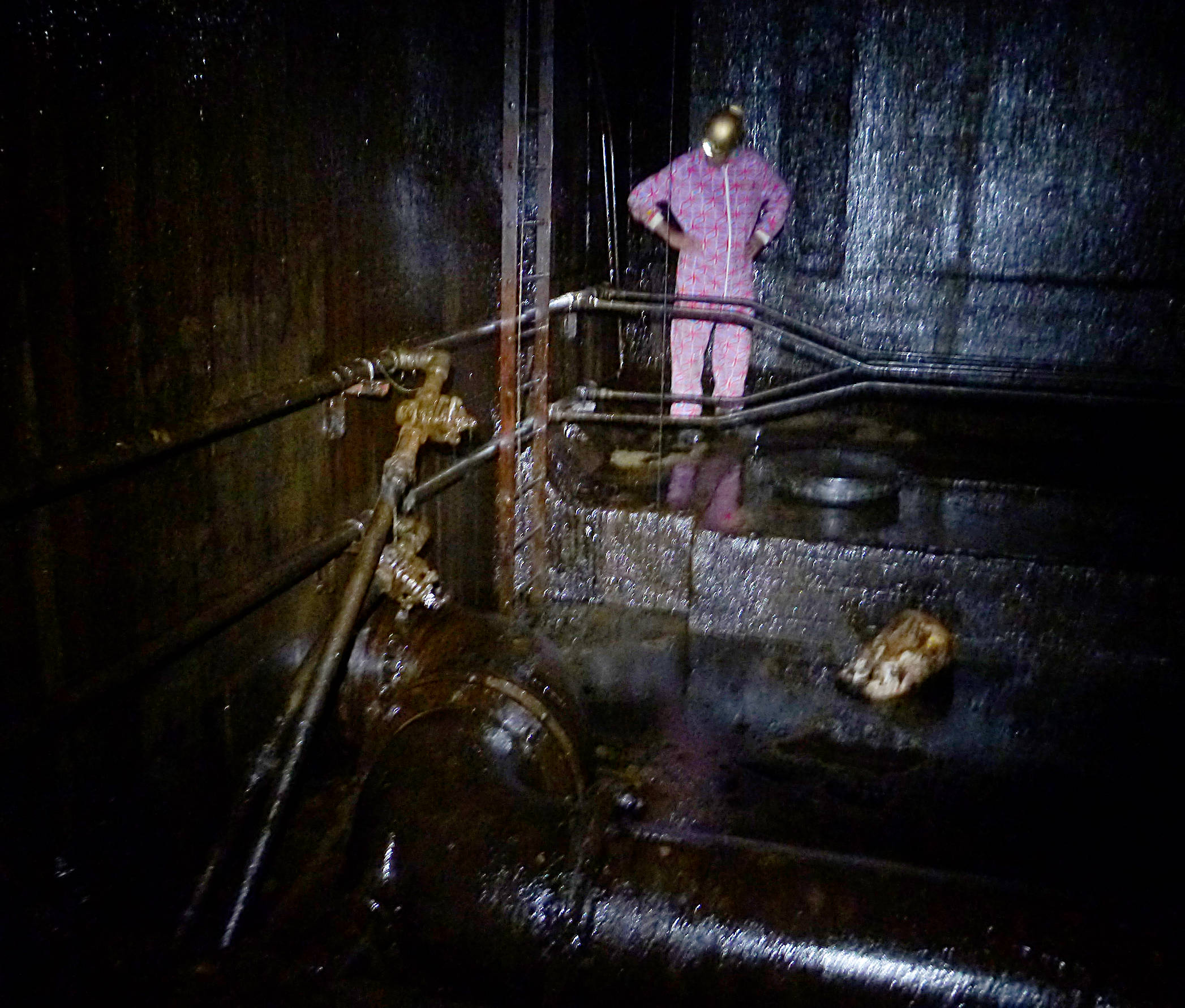 The large pipe in the foreground is the main inlet/outlet pipe; the ladder and winch line go up to a platform and connection with the main tunnel.
